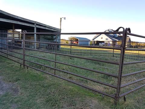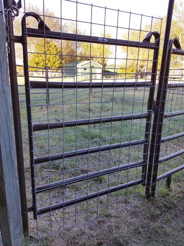We use this 6 foot chain link enclosure mainly for breeding and lambing. There is barbed wire at the bottom on both sides of the pen. The sheep push on the chain link to get the grass, Even when there is grass in the pen for them to eat! Thus I had to barb wire the inside! This pen is large enough for all the ewes we have bred to lamb in a safe area close to our house. There are several trees to provide shade, and if I use the pen when it gets warm, I have a shade cloth to provide more shade. It also has adequate shelters, a creep feeder with a small shelter, wind breaks, and a catch pen. I plan to make this catch pen more versatile and get a roof over it and panel the North and South sides.